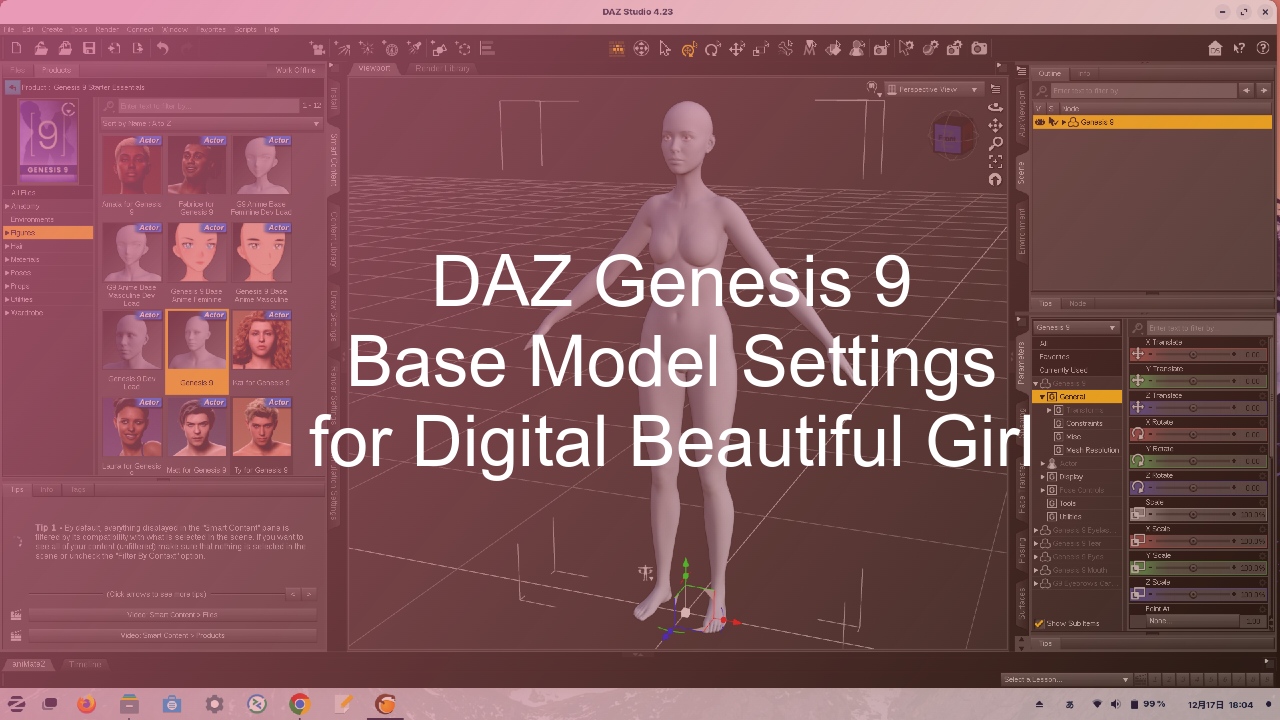 Genesis 9ベースモデルは男女兼用でデフォールトは男性体型なので、デジタル美少女向けにベースモデルを変身させる身体パラメーターの設定変更は、以下の記事で紹介しています。